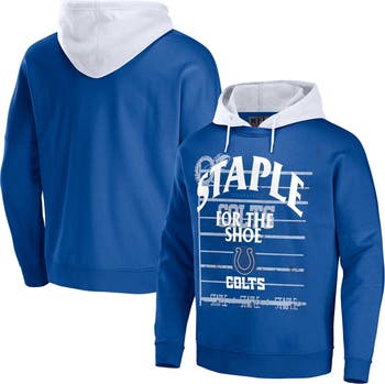The Men's NFL x Staple Blue Indianapolis Colts Throwback Vintage Wash Pullover Hoodie is a must-have for any devoted Indianapolis Colts fan. Crafted from a cotton and polyester blend, this midweight hoodie is perfect for moderate temperatures. Screen printed graphics proudly display your Colts allegiance, making it the ideal way to show your support for the team. Whether you're cheering from the stands or simply showing your team spirit, this hoodie is sure to become a favorite.