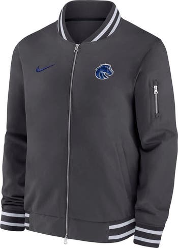 Embrace those cool game days with this Boise State Broncos Full-Zip Bomber Jacket from Nike. This bomber jacket is crafted from 100% recycled polyester, making it a sustainable choice for eco-conscious fans. The striped rib-knit cuffs, stand-up collar, and hem offer a comfortable and secure fit, while the embroidered Boise State Broncos logo and wordmark proudly display your team spirit.
