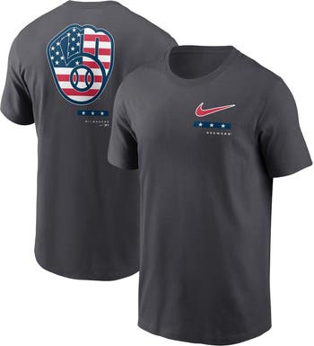 Combine your patriotic spirit with your love for the Milwaukee Brewers by sporting this Americana T-shirt by Nike. A classic crew design and soft fabric offer comfort with each wear. Distinct Milwaukee Brewers graphics with symbolic touches makes for a spirited layer.