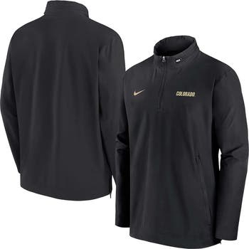 Get comfortable on the sidelines this season with this Colorado Buffaloes Sideline Coach Quarter-Zip Hoodie Jacket from Nike. This jacket utilizes water-repellent, four-way stretch woven fabric to keep you dry and moving freely, whether you're cheering from the stands or braving the elements on game day. A convenient hood that tucks into the back collar, a pouch pocket with zippered sides, and side zipper vents elevate this jacket from standard fan gear to a functional piece you'll reach for again and again.