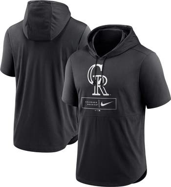 The Men's Nike Black Colorado Rockies Lockup Performance Short Sleeve Lightweight Hooded Top is the perfect way to show your support for the Colorado Rockies. Made from lightweight polyester, this top features a front pouch pocket with mesh lining, a hood with drawstring, and screen print graphics that proudly display your Rockies pride. The rounded hem and pullover design make this top comfortable and easy to wear, whether you're cheering on the Rockies at the stadium or just relaxing at home.