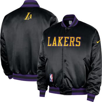 Gear up for game day with this Los Angeles Lakers 2025/26 City Edition Remix Courtside Full-Snap Bomber Jacket from Nike. This heavyweight jacket is fully lined for added insulation, making it perfect for those colder game days, and features a relaxed, boxy fit for a stylish and comfortable feel. The embroidered fabric appliques graphics and ribbed details add a touch of premium quality, making it the true fan's choice for repping the Los Angeles Lakers.