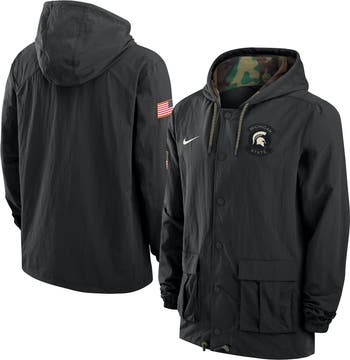 Proudly support the Michigan State Spartans in this 2025 NCAA Military Appreciation Full-Snap Jacket by Nike. It's crafted from water-resistant recycled nylon to ensure you stay dry and comfortable on rainy days. The drawstring hem allows for a customizable fit, while a camo-lined hood and elastic cuffs give you added coverage from the elements in this Michigan State Spartans jacket.