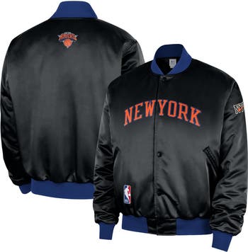 Gear up for game day with this New York Knicks 2025/26 City Edition Remix Courtside Full-Snap Bomber Jacket from Nike. This heavyweight jacket is fully lined for added insulation, making it perfect for those colder game days, and features a relaxed, boxy fit for a stylish and comfortable feel. The embroidered fabric appliques graphics and ribbed details add a touch of premium quality, making it the true fan's choice for repping the New York Knicks.
