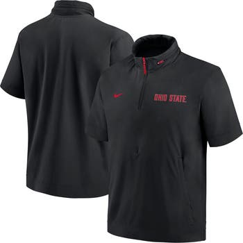 This Ohio State Buckeyes 2024 Sideline Coach half-zip jacket by Nike delivers premium comfort on game day without the added bulk of a long-sleeve hoodie. Its blended material features a lightweight feel, four-way stretch flexibility and an understated Ohio State Buckeyes wordmark. The hood provides added coverage and conveniently fits inside the collar when not in use.