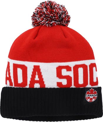 Take on any weather in Canada Soccer style with this knit hat from Nike. It features the team's crest on a clip tag and woven team graphics with matching stripes. The cuffed design and pom on top come together to make this Canada Soccer hat an instant classic.