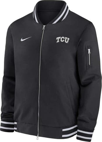Embrace those cool game days with this TCU Horned Frogs Full-Zip Bomber Jacket from Nike. This bomber jacket is crafted from 100% recycled polyester, making it a sustainable choice for eco-conscious fans. The striped rib-knit cuffs, stand-up collar, and hem offer a comfortable and secure fit, while the embroidered TCU Horned Frogs logo and wordmark proudly display your team spirit.