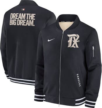 Represent the Texas Rangers and your city in style with this Authentic Collection City Connect Full-Zip Bomber Jacket. Crafted by Nike, this authentic, on-field gear features a water-repellent finish to keep you dry and looking your best on game days. With stylish Texas Rangers City Connect tackle twill applique on the front, you'll be able to showcase your team and city pride all season long.