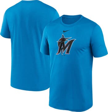 The Men's Nike Blue Miami Marlins Legend Fuse Large Logo Performance T-shirt is the perfect way to show your support for the Miami Marlins. Made from breathable polyester, this T-shirt features Dri-FIT technology to keep you cool and comfortable all game long. The crew neck and screen print graphics add a touch of style, while the large Miami Marlins logo on the front shows your team spirit. Whether you're cheering from the stands or just hanging out, this T-shirt is a must-have for any Miami Marlins fan.
