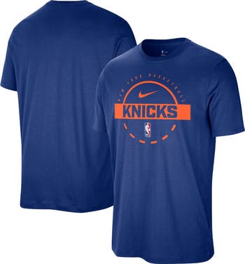 Elevate your training regimen with this New York Knicks Authentic Practice T-Shirt from Nike. The rib-knit collar and tagless design will keep you comfortable whether you're hitting the court or relaxing at home. The printed team graphics, NBA Shield, and Nike Swoosh on the front display your New York Knicks Nike pride in style.