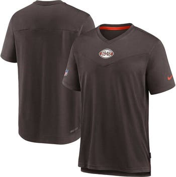 The Men's Nike Brown Cleveland Browns Sideline Coaches Vintage Chevron Performance V-Neck T-Shirt is a must-have for any devoted Cleveland Browns fan. This stylish tee features heat-sealed graphics that proudly display your team allegiance. The perforated front and back yoke ensures breathability and comfort. The droptail hem with side splits adds a touch of flair, and the UPF 40+ sun protection keeps you safe from the elements. Whether you're cheering from the stands or just showing your support, this T-shirt is the perfect way to represent the Cleveland Browns.