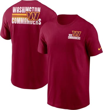 The Nike Burgundy Washington Commanders Blitz Essential T-shirt is the ultimate way to showcase your unwavering support for the Commanders. Crafted from soft cotton, this tee boasts screen-printed graphics that proudly display the iconic Commanders logo. The classic crew neck and relaxed fit ensure both comfort and style, making it the perfect choice for game day or any casual occasion. Whether you're cheering from the stands or simply expressing your team spirit, this T-shirt is a must-have for every true Washington Commanders fan.
