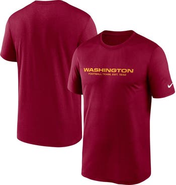 The Nike Burgundy Washington Football Team Logo Essential Legend Team Performance T-shirt is the ultimate fan gear for Washington Football Team supporters. Crafted from breathable polyester, this t-shirt incorporates Nike Dry fabrics that efficiently wick away sweat, ensuring utmost comfort and focus during the game. The prominent Washington Football Team logo adorns the chest, showcasing unwavering team loyalty. Additionally, the Dri-FIT technology guarantees dryness and comfort throughout the entire game.