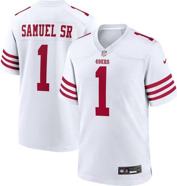 Rep the on-field look of your favorite San Francisco 49ers player with this Deebo Samuel Sr Game Player Jersey from Nike. Its heat-sealed name, numbers and team details provide a kickoff-ready aesthetic while also offering a comfortable, lightweight feel. Designed for everyday movement, this jersey has a versatile tailored fit and features mesh side panels for added ventilation as you celebrate every big play by the San Francisco 49ers this season.