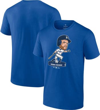 Celebrate your unwavering support for the Los Angeles Dodgers with the Men's Nike Freddie Freeman Royal Los Angeles Dodgers Bobblehead T-shirt. This cotton tee features a vibrant screen print graphic of Freddie Freeman, capturing the spirit of the Dodgers' iconic first baseman. Whether you're cheering from the stands or representing your team off the field, this T-shirt is the perfect way to show your Los Angeles Dodgers pride.