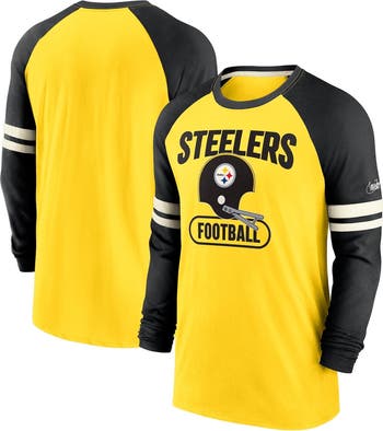 The Men's Nike Gold/Black Pittsburgh Steelers Throwback Raglan Long Sleeve T-Shirt is a must-have for any devoted Pittsburgh Steelers fan. With its classic raglan sleeves and screen print graphics, this T-shirt proudly displays your unwavering support for the Steelers. The crew neck and rounded hem provide a comfortable fit, while the sewn-on, contrast-color stripes add a touch of style. Whether you're cheering from the stands or simply showing your team spirit, this T-shirt is the perfect way to represent the Pittsburgh Steelers.