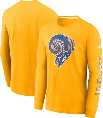 The Nike Gold Los Angeles Rams Fashion Tri-Blend Long Sleeve T-Shirt is the perfect way to show your support for the Rams. Made from a comfortable polyester, cotton, and rayon blend, this shirt features distressed screen print graphics for a vintage look. The crew neck and long sleeves make it ideal for layering on game day or any day. Whether you're cheering from the stands or just showing your support, this shirt is a must-have for any fan.