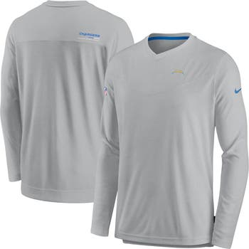 The Men's Nike Gray Los Angeles Chargers Sideline Coach Chevron Lock Up Long Sleeve V-Neck Performance T-shirt is the perfect way to show your support for the Los Angeles Chargers. Made from lightweight polyester, this shirt features Dri-FIT technology to keep you cool and comfortable all game long. The V-neck design and droptail hem with side splits provide a stylish and comfortable fit, while the rubberized heat-sealed graphics ensure your team pride will never fade. Whether you're cheering from the stands or just relaxing at home, this shirt is a must-have for any Los Angeles Chargers fan.