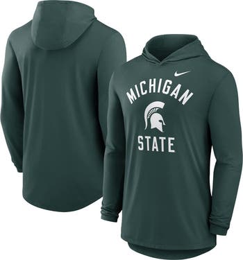 Upgrade your Michigan State Spartans tee with this Classic Arch Tri-Blend Performance Long Sleeve Hoodie T-Shirt by Nike. It combines lightweight jersey fabric and sweat-wicking Dri-FIT technology to keep you cool and dry. The rounded droptail gives this Michigan State Spartans shirt added coverage for a more comfortable fit and feel.