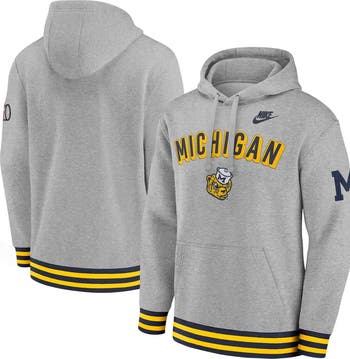 Stay warm in throwback style with this Michigan Wolverines Legacy Retro Pullover Hoodie by Nike. Embroidered appliques and rib-knit trim add vintage touches to the modern design. Dropped shoulders provide plenty of room for comfortable movement, while cozy fleece fabric keeps you comfy in this classic Michigan Wolverines hoodie.