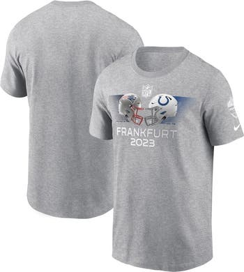 Get ready for your favorite team's trip across the pond with this 2023 Frankfurt Game Essential T-Shirt from Nike. This tee is exactly what you need to commemorate the matchup between the New England Patriots and Indianapolis Colts. Graphics on the front chest and left sleeve highlight the big clash in Germany.