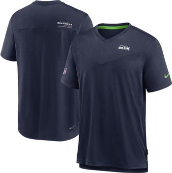 The Men's Nike Heather Navy Seattle Seahawks Sideline Coach Chevron Lock Up Logo V-Neck Performance T-shirt is the ultimate way to show your unwavering support for the Seattle Seahawks. Crafted from lightweight polyester, this T-shirt boasts Dri-FIT technology, ensuring you stay cool and comfortable throughout the game. The stylish V-neck design and droptail hem with side splits provide a comfortable fit, while the rubberized heat-sealed graphics guarantee your Seahawks pride remains unfaded. Whether you're cheering from the stands or watching the game at home, this T-shirt is a must-have for any true Seahawks fan.