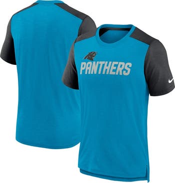 The Men's Nike Heathered Blue/Heathered Black Carolina Panthers Color Block Team Name T-shirt is the perfect way to show unwavering support for the Carolina Panthers. This stylish tee features a crew neck, droptail hem with side splits, and bold screen print graphics proudly displaying the Panthers' team name. Made from a comfortable cotton and polyester blend, this t-shirt is perfect for game day or any day you want to show your Panthers pride.