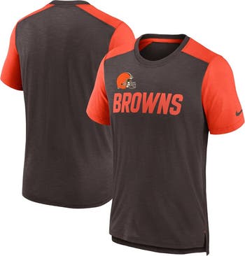 The Men's Nike Heathered Brown/Heathered Orange Cleveland Browns Color Block Team Name T-shirt is a must-have for loyal Cleveland Browns fans. Bold screen print graphics and a comfy cotton-polyester blend make this tee perfect for game day or showing support. Crew neck and droptail hem with side splits provide a relaxed fit, while screen print graphics proudly display Cleveland Browns pride. Whether cheering from the stands or watching at home, this tee is the way to show support for the Cleveland Browns.