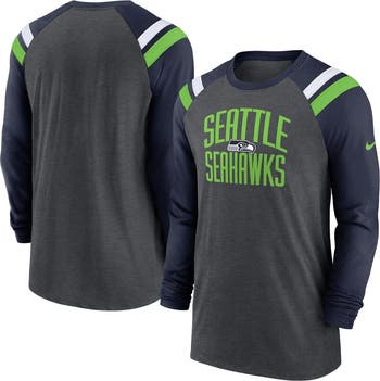The Men's Nike Heathered Charcoal/College Navy Seattle Seahawks Tri-Blend Raglan Athletic Long Sleeve Fashion T-Shirt is the perfect way to show your unwavering support for the Seattle Seahawks. With its comfortable cotton, polyester, and rayon blend, this long sleeve tee is perfect for game day or any day. The raglan sleeves and sewn-on stripes add a touch of style, while the screen print graphics proudly display your Seahawks pride. Whether you're cheering from the stands or just hanging out, this shirt is sure to make you feel like part of the team.