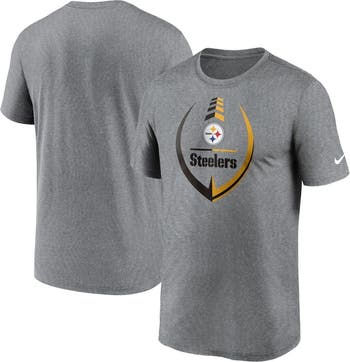 The Men's Nike Heathered Gray Pittsburgh Steelers Icon Legend Performance T-shirt is the perfect way to show unwavering support for the Pittsburgh Steelers. Made from breathable polyester, this performance tee features Dri-FIT technology to keep you cool and comfortable during the game. Screen-printed graphics proudly display the Steelers logo, letting you represent your team with style. Whether cheering from the stands or watching from home, this tee is a must-have for any Steelers fan.