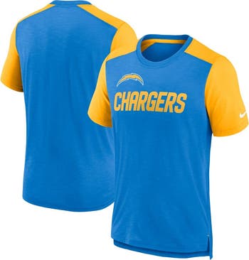 The Men's Nike Heathered Powder Blue/Heathered Gold Los Angeles Chargers Color Block Team Name T-shirt is the perfect way to show unwavering support for the Los Angeles Chargers. With bold screen print graphics and a comfortable cotton-polyester blend, this T-shirt is perfect for game day or any day. The crew neck and droptail hem with side splits provide a comfortable fit, while the screen print graphics proudly display Los Angeles Chargers pride. Whether cheering from the stands or hanging out, this T-shirt is sure to become a favorite.