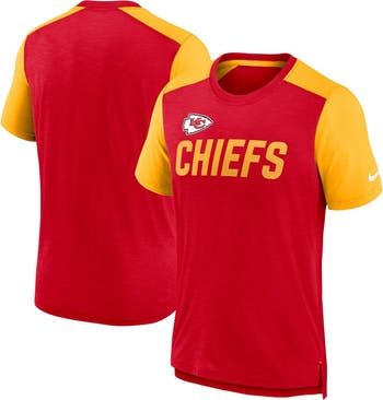 Celebrate your unwavering Kansas City Chiefs fandom with the Men's Nike Heathered Red/Heathered Gold Kansas City Chiefs Color Block Team Name T-Shirt. This stylish tee features a crew neck, droptail hem with side splits, and bold screen print graphics that proudly display your allegiance to the Kansas City Chiefs. Made from a comfortable cotton and polyester blend, this t-shirt is perfect for game day or any day you want to show your support for the Chiefs.