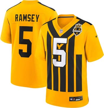 Show your unwavering support for the Pittsburgh Steelers with this Jalen Ramsey 1933 Throwback Game Jersey. This Nike jersey boasts a loose fit designed for movement and mesh side panels for extra breathability, ensuring comfort whether you're at the game or on the go. The meticulously stitched NFL Shield at the collar and screen-printed name, numbers, and team details showcase your Steelers pride with premium quality. Complete with side splits at the hem and a satin woven jock tag, this jersey combines classic design with modern comfort.