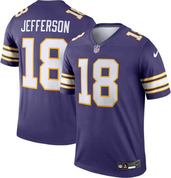 Honor the legacy of Fran Tarkenton and the Purple People Eaters with this throwback-inspired Minnesota Vikings Justin Jefferson Classic Legend Player Jersey.This Nike gear features gold and white stripes on the sleeve and the gold trim around the numbers replicates the jerseys worn in the 1970s when the Purple People Eaters were wreaking havoc on opposing quarterbacks. The exciting graphics let you think back on the past while looking ahead to the next Minnesota Vikings season.