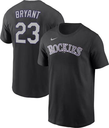 Before Kris Bryant steps on the field for the next Colorado Rockies game, gear up in this Name and Number T-shirt from Nike. Its lightweight cotton fabric is breathable and comfortable, perfect for the midsummer heat of baseball season. The back features printed graphics that highlight your admiration for Kris Bryant.