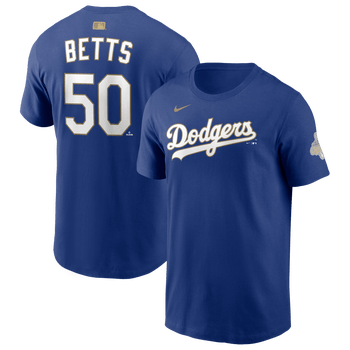 Celebrate the Dodgers' World Series victory and a thrilling performance from a baseball Superstar with this Mookie Betts 2026 Gold Collection Name & Number T-Shirt from Nike. As part of the MLB Gold Collection, this shirt commemorates the reigning World Series champions in elevated, premium style. The team logo is proudly displayed on the front, while the 2025 World Series Champion graphic is printed on the left sleeve, making it a standout piece for any fan. With its comfortable, midweight fabric and tagless collar, this tee provides all-day comfort, while the team jersey-inspired player name and number will make you feel like you're part of the team.