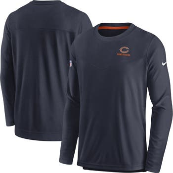 The Men's Nike Navy Chicago Bears Sideline Lockup Performance Long Sleeve T-Shirt is the perfect way to show your unwavering support for the Chicago Bears. Made from a comfortable polyester and spandex blend, this long sleeve tee features screen print graphics that proudly display your team pride. The droptail hem with side splits provides a stylish and comfortable fit, while the Dri-FIT technology helps keep you dry and comfortable all game long. As part of Nike's Move To Zero initiative, this shirt is made with at least 55% recycled content.