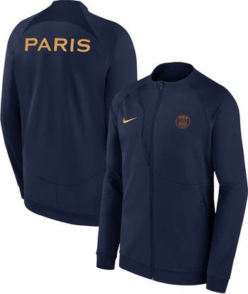 Represent your beloved Paris Saint-Germain with the Men's Nike Navy Paris Saint-Germain 2023 Academy Pro Anthem Full-Zip Jacket. With its embroidered fabric applique and zipper garage, this jacket is perfect for showing your Paris Saint-Germain pride. The raglan sleeves and two zippered pockets provide both comfort and functionality. Whether you're at the Parc des Princes or watching from home, this jacket will keep you warm and stylish while you cheer on Paris Saint-Germain.