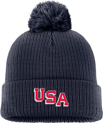 Face off against cold weather confidently in this US Hockey Peak Cuffed Knit Hat with Pom by Nike. Cashmere-like yarns provide unparalleled softness and warmth for a comfy feel. Embroidered details and a team logo clip tag complement the solid design of this stretchy US Hockey hat.