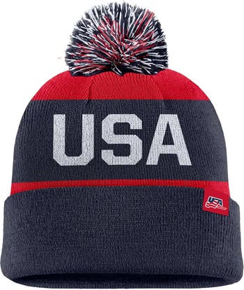 Prepare to support US Hockey during cold weather in this Peak Stripe Cuffed Knit Hat with Pom by Nike. Cashmere-like yarns offer supreme softness and warmth to keep you comfy. Wide stripes and a multicolor pom accentuate the team logo and jacquard letters, drawing attention to your US Hockey fandom.