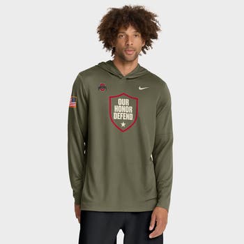 Show your support for the armed forces and Ohio State Buckeyes with this 2025 Military Appreciation Dri-FIT Long Sleeve Hoodie T-Shirt by Nike. Its military-inspired design features a large team logo printed on lightweight fabric and an embroidered American flag patch. Sweat-wicking Dri-FIT technology keeps you dry and comfortable in this Ohio State Buckeyes top as you honor those who serve.