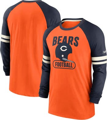 The Men's Nike Orange/Navy Chicago Bears Throwback Raglan Long Sleeve T-Shirt is a must-have for any devoted Chicago Bears fan. With its classic raglan sleeves and screen print graphics, this shirt proudly displays your unwavering support for the Bears. The cotton material ensures comfort and breathability, making it perfect for game day or any day you want to show off your team spirit.