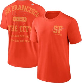 Celebrate your unwavering support for the San Francisco Giants with the Men's Nike Orange San Francisco Giants Statement Game Over T-shirt. This vibrant tee features bold screen-printed graphics that proudly display your Giants allegiance. Made from a comfortable cotton and polyester blend, it's perfect for cheering on your team at the ballpark or showing your Giants pride wherever you go.