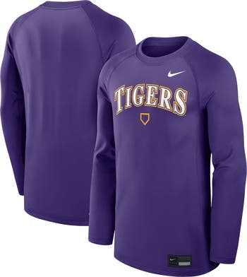 Easily move around while wearing this LSU Tigers Dugout Game Time Raglan Dri-FIT Long Sleeve T-Shirt by Nike. It features four-way stretch French terry fabric and raglan sleeves for flexible movement on and off the field. Sweat-wicking technology ensures you stay dry and comfortable in this LSU Tigers shirt.