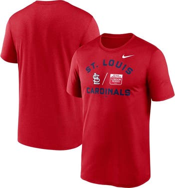 The Men's Nike Red St. Louis Cardinals 2023 MLB World Tour: London Series Legend Performance T-shirt is the perfect way to show your support for the St. Louis Cardinals. Made from breathable polyester, this T-shirt features Dri-FIT technology to keep you cool and comfortable all game long. The crew neck and screen print graphics add a touch of style, while the St. Louis Cardinals logo proudly displays your team spirit. Whether you're cheering from the stands or watching from home, this T-shirt is a must-have for any Cardinals fan.