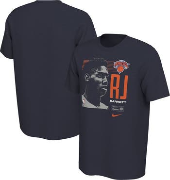 The Men's Nike RJ Barrett Navy New York Knicks 2019 NBA Draft First Round Rookie T-Shirt is a must-have for any true New York Knicks fan. With its bold screen print graphics, this shirt proudly displays your unwavering support for the Knicks and their rising star, RJ Barrett. Whether you're cheering from the stands or watching the game at home, this shirt will let everyone know that you're a loyal Knicks fan through and through.