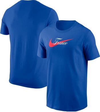 Show your support for the France National Team with this Nike Team Wordmark Swoosh Core T-Shirt. This classic crew neck tee is made from 100% cotton, offering a comfortable feel whether you're cheering from the stands or representing the national team on the streets. The screen-printed graphic features a bold wordmark with "France" elegantly scripted over the iconic Nike swoosh, making a statement of athletic pride.