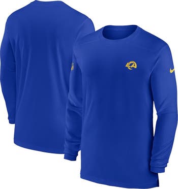 The Men's Nike Royal Los Angeles Rams Sideline Coach Performance Long Sleeve T-shirt is the perfect way to show your support for the Los Angeles Rams. Made from breathable polyester, this shirt features Dri-FIT technology to keep you cool and comfortable all game long. Screen print graphics and side splits at the waist hem add a touch of style, while the crew neck provides a classic look. Whether you're cheering from the stands or watching the game at home, this shirt is sure to make you feel like part of the team.