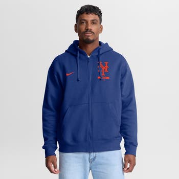 Brave chilly weather comfortably in this New York Mets Primetime Lockup Full-Zip Hoodie by Nike. Midweight fleece fabric keeps you cozy and warm, while an adjustable scuba hood provides extra coverage. The team logo patch adds a premium touch to thisNew York Metshoodie.