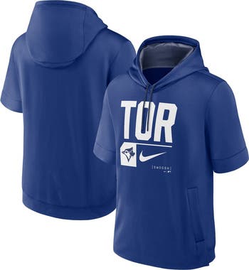The Men's Nike Royal Toronto Blue Jays Tri Code Lockup Short Sleeve Pullover Hoodie is the perfect way to show your support for the Toronto Blue Jays. Made from soft and comfortable polyester, this hoodie features a mesh-lined hood, two front pockets, and a rounded hem with side splits. The screen-printed graphics proudly display the Toronto Blue Jays logo, making this hoodie a must-have for any fan. Whether you're cheering on the Blue Jays at the Rogers Centre or just relaxing at home, this hoodie will keep you comfortable and stylish.